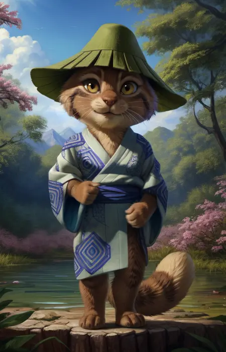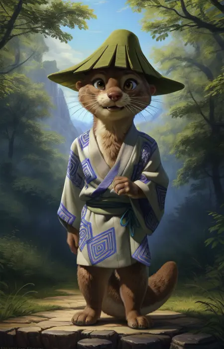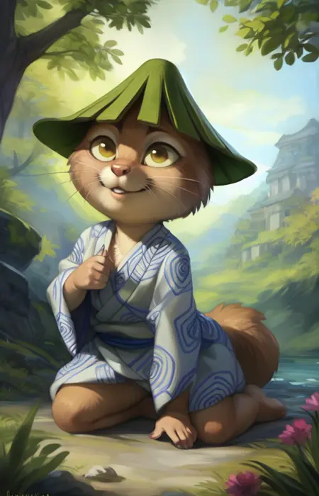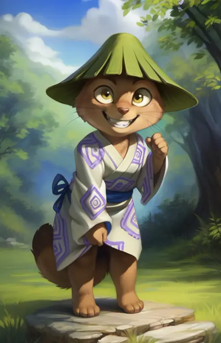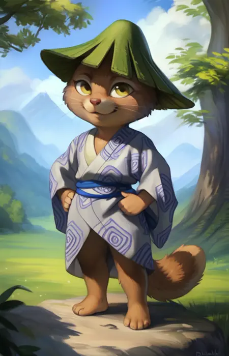 KawausoGeKi, yellow eyes, brown fur, green hat, blue belt, Yukata, kimono,