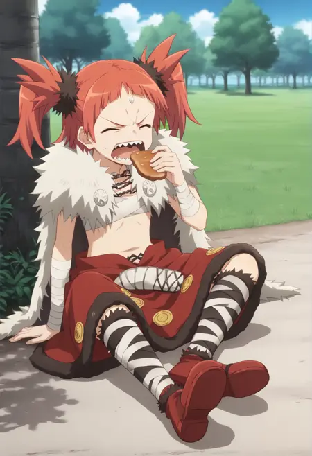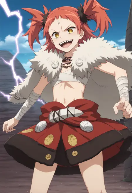 显著标签:红发、中长发、双马尾、黄眼睛、额头宝石、裹胸布、野蛮人、毛皮镶边、毛皮斗篷、绷带、绷带手臂、斗篷、裙子、靴子、尖牙,