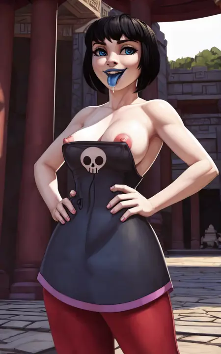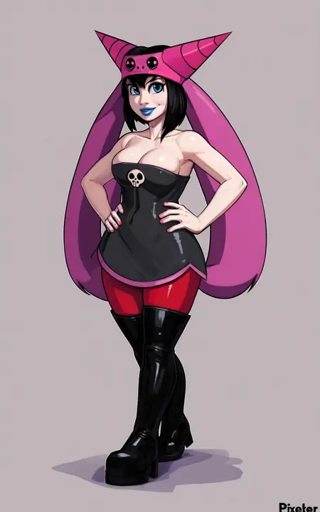 Reinforcement Tags: blue lips, white skin, black hair, short hair, blue sclera**For her Outfit: boots, black boots, pants, red pants, harem pants, grey dress, dress, skull, strapless, bare shoulders, cleavage