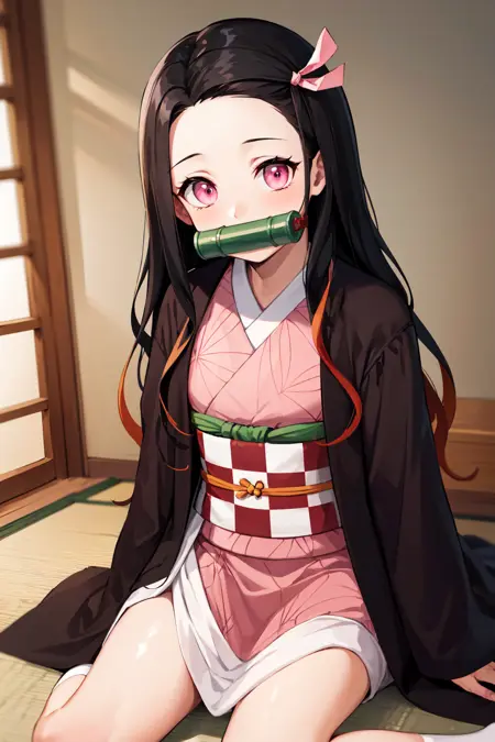 outfit1aanezuko, long hair, multicolored hair, hair ribbon, bit gag, mouth hold, japanese clothes, pink kimono, haori, black jacket, long sleeves, checkered sash, obi