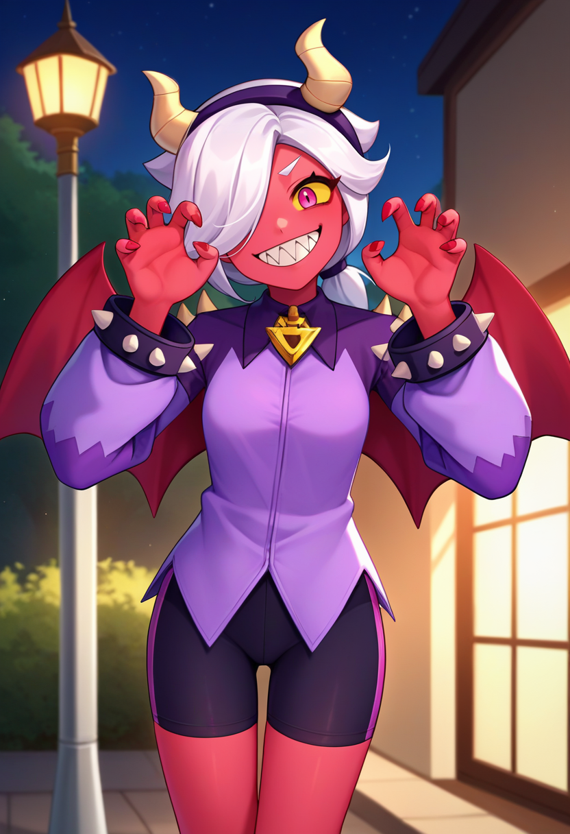 トリクシー: colettetrixie, red skin, sharp teeth, hair over one eye, hairband, demon horns, pink eyes, yellow sclera, spikes, purple shirt, long sleeves, sleeves past fingers, purple shorts, bike shorts, demon wings