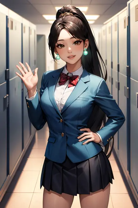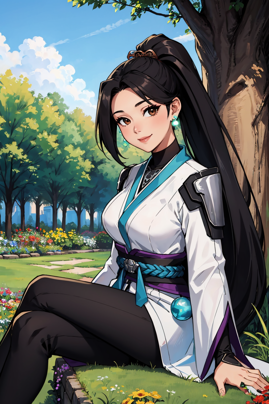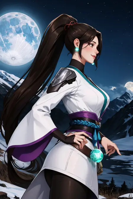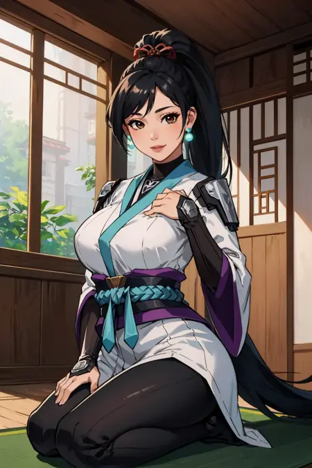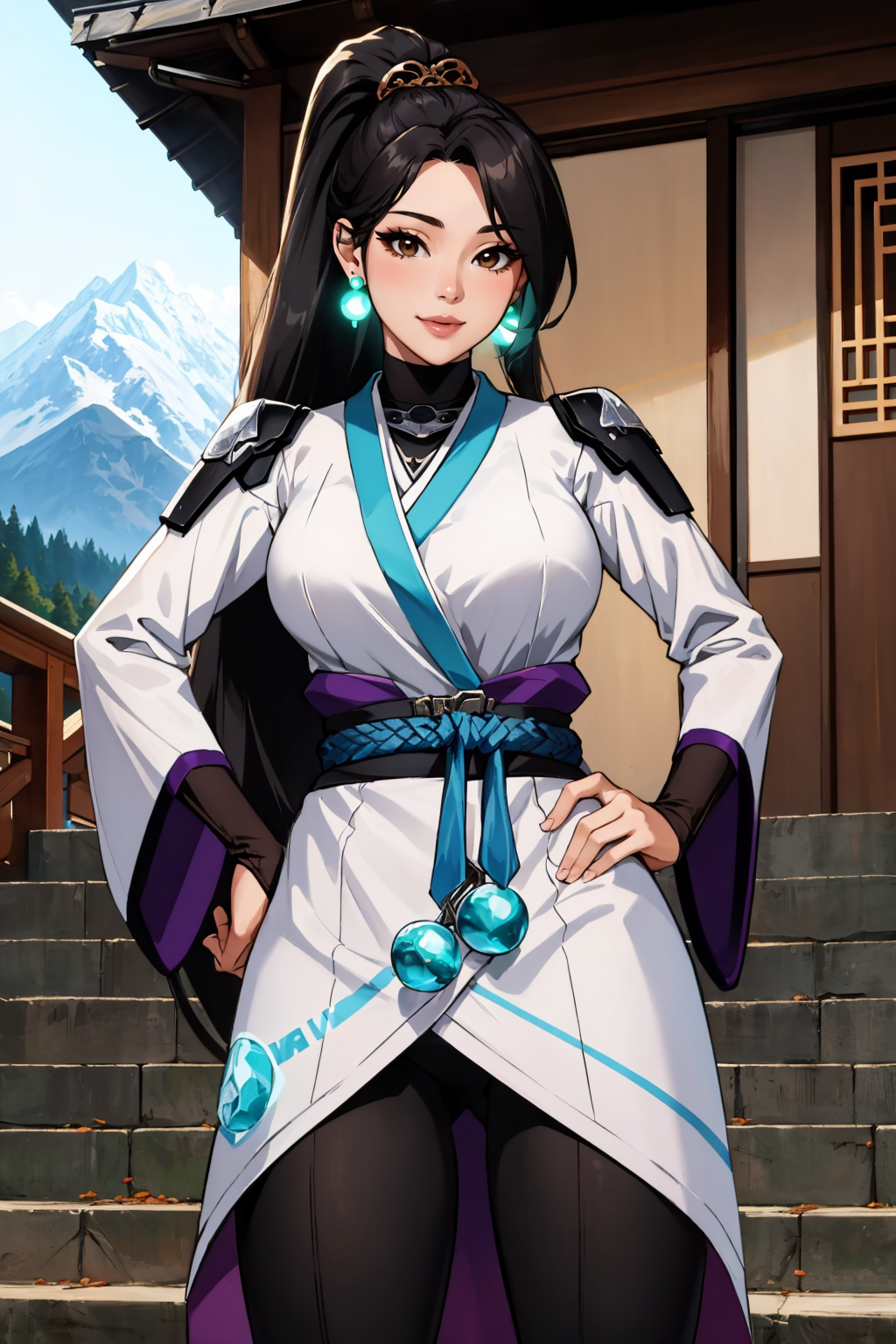 彼女の典型的な外見には、「イヤリング、白いローブ、ブライダルグローブ、帯、黒いズボン」を追加してください。