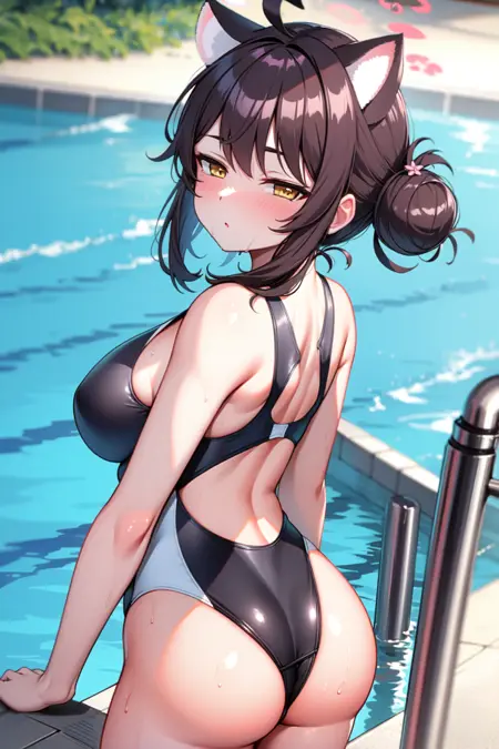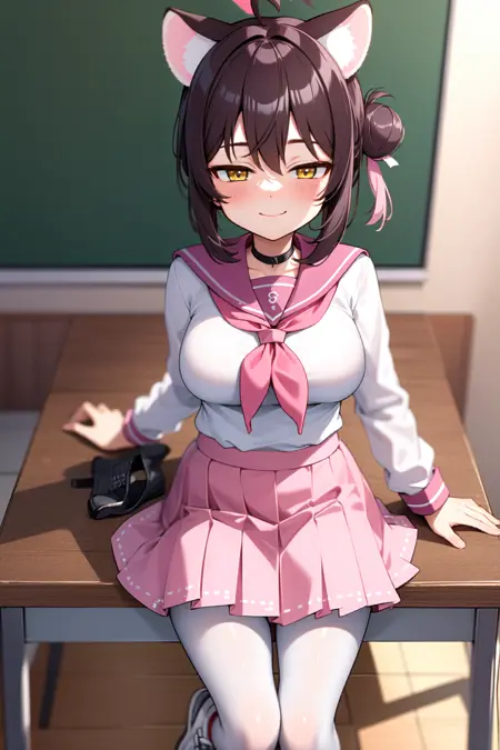 외모: 카에데, 노란 눈, 갈색 머리카락, 아호게, 머리 둥글림, 한쪽 머리 둥글림, 동물 귀, 머리 장식, 환상