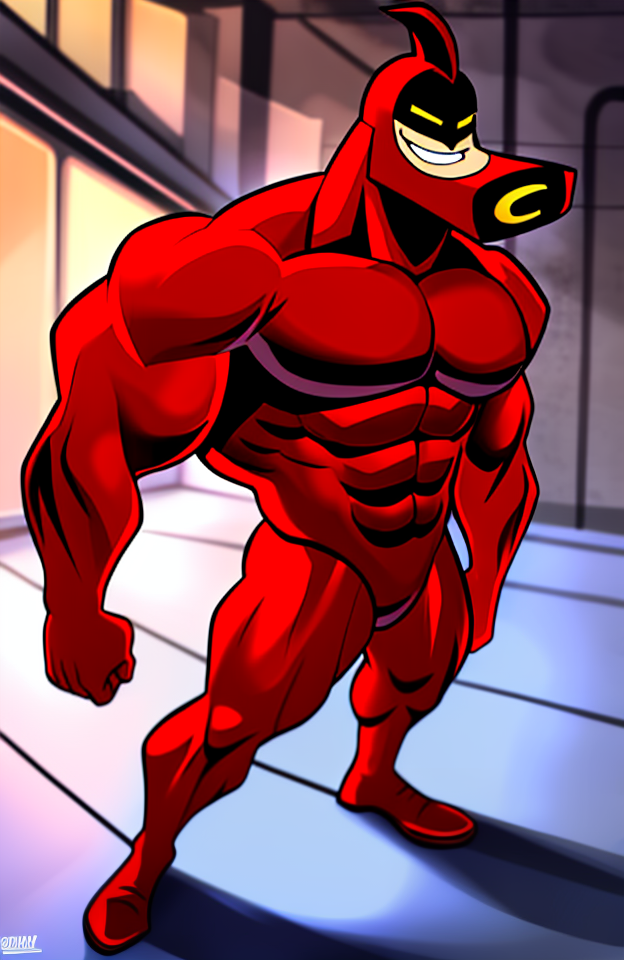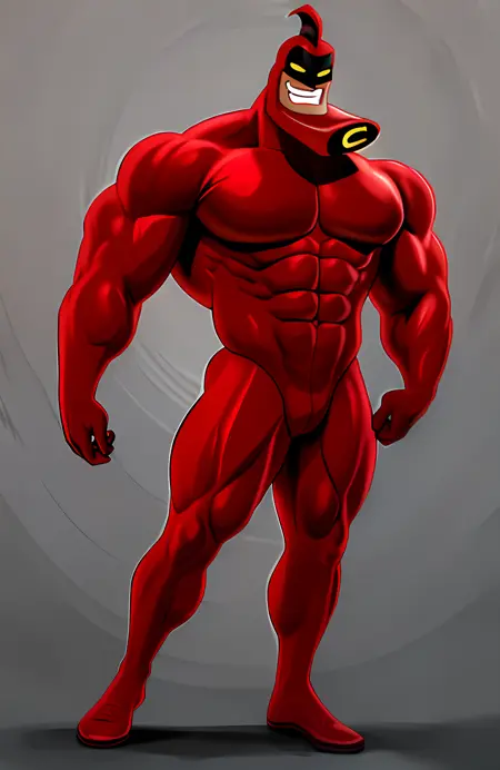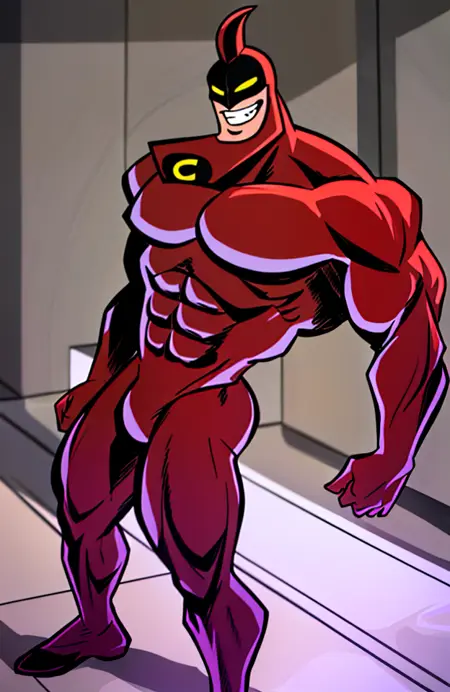 crimson_chin, 1boy, male focus, muscular, solo, yellow eyes, abs, smile, teeth, big chin, smirk, grin, standing, full body, muscular male, bodysuit, mask, glowing yellow eyes, human face, human mouth, lips, pectorals
