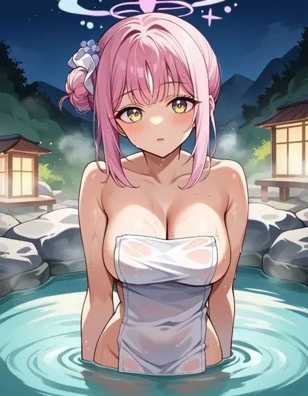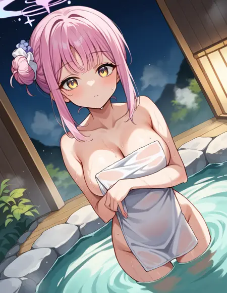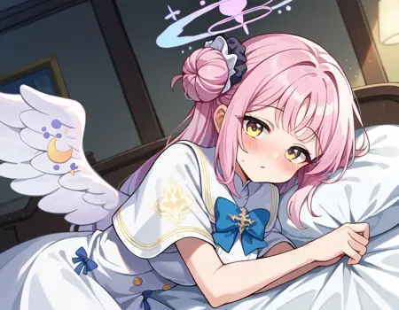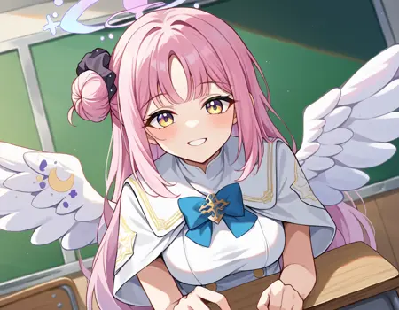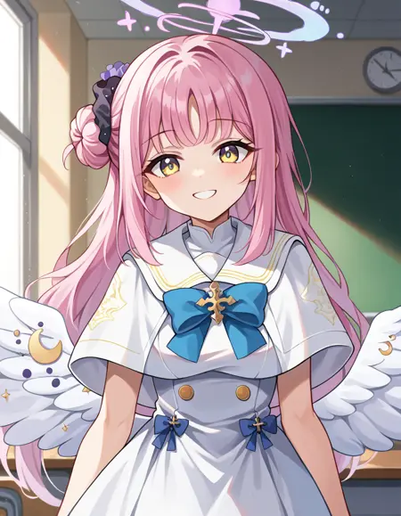 mika misono, yellow eyes, pink hair, hair bun, halo, single side bun,