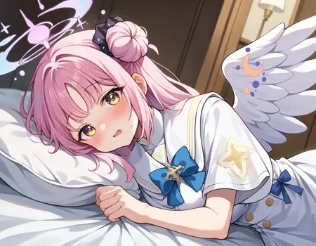angel wings, black scrunchi, capelet, dress, halo, low wings, pink halo, scrunchie, white capelet, white dress, white wings, wings,