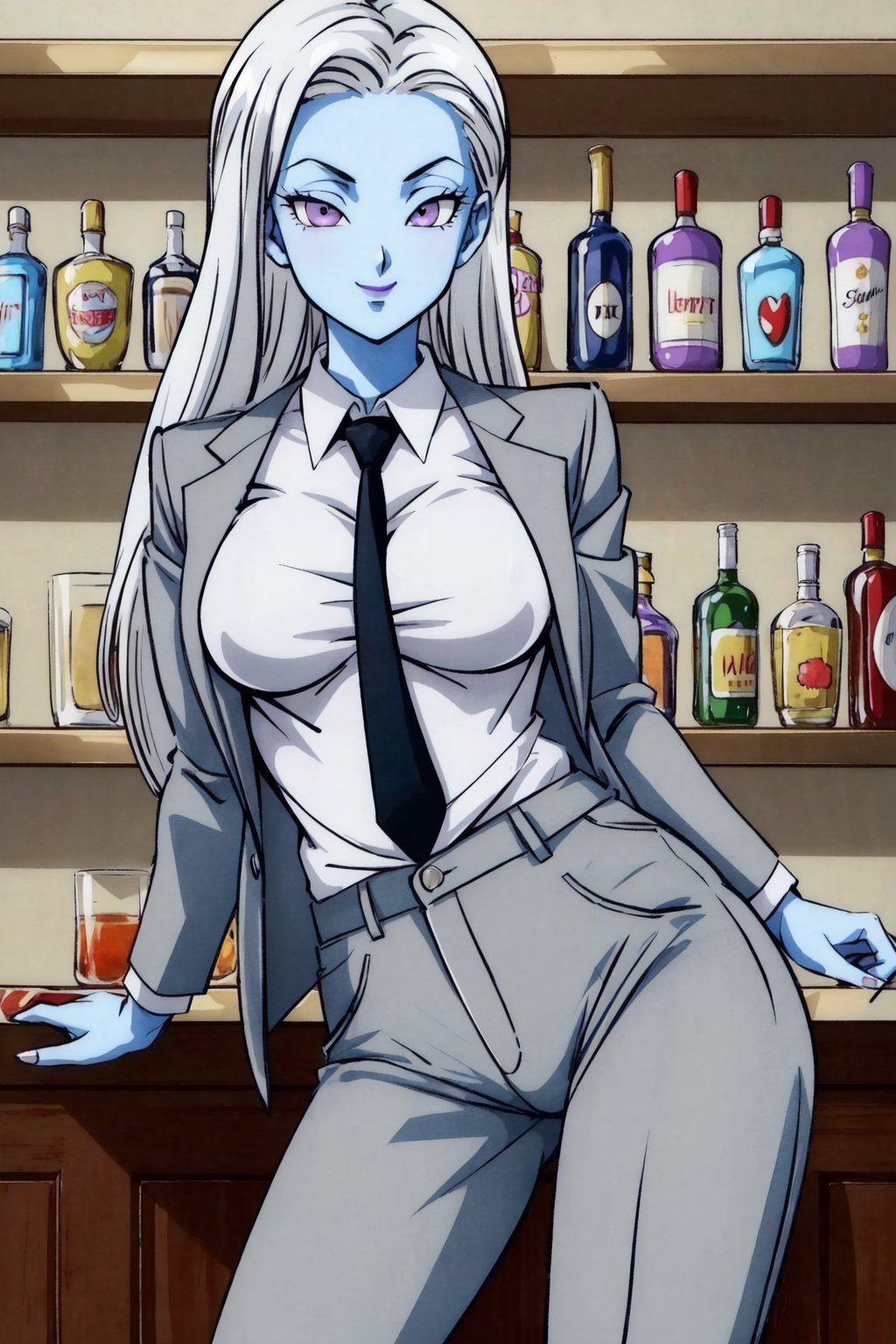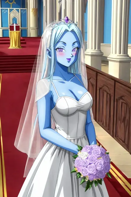 vados,薄い青い肌,白い髪,紫色の目,紫色の唇,高いポニーテール,髪を後ろにまとめる,ハロー