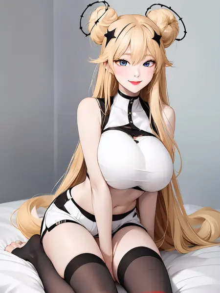 服装(我试了下lal): 白色短上衣,露出下胸围,露腹,白色短裤,黑色肩带,不对称腿部穿搭,渐变腿部穿搭,黑色丝袜,黄色丝袜,