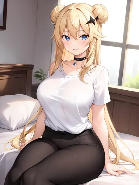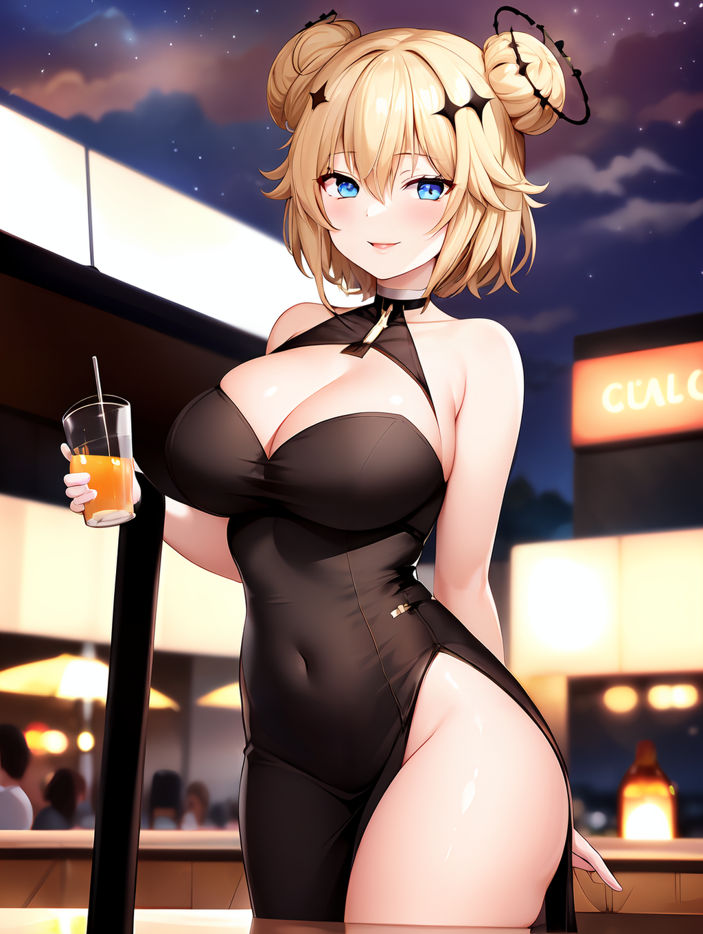 标签: kanekolumi, 金发, 发丝遮眼, 长发, 蓝眼, 黑色星形发饰, 双丸子头, 黑色光环,