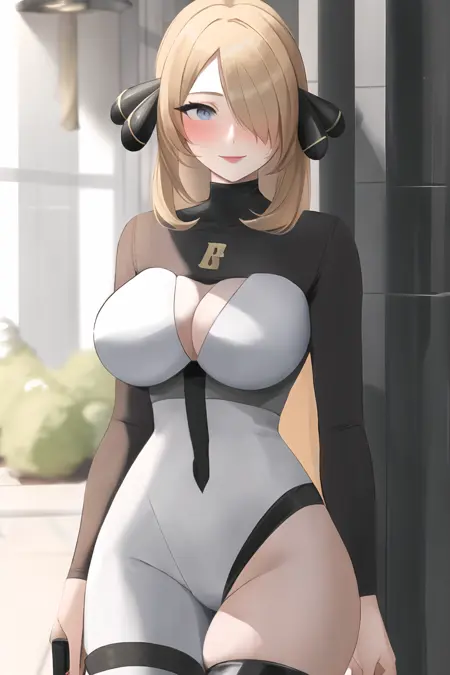 의상: 바디수트, 노출된 다리, 비대칭적인 하의, 긴 소매, 허벅지 밴드, 허벅지 스트랩