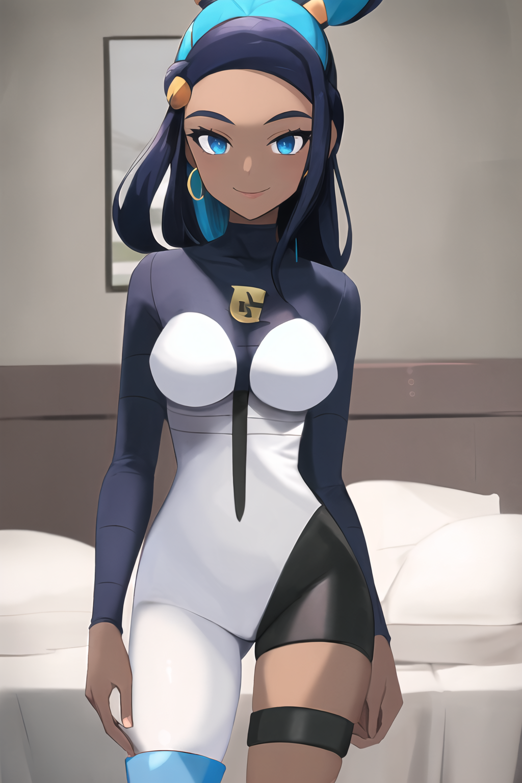 Clothing: bodysuit, bare leg, assymetrical legwear, long sleeves, thighband, thigh strap