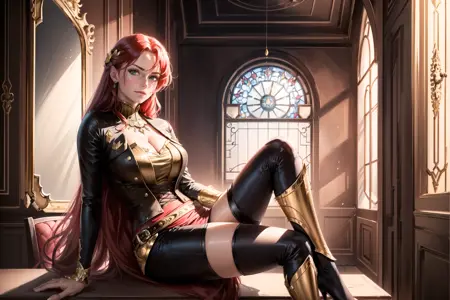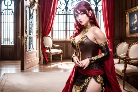 postive promt for most of the Indoor pictures: ((best quality)), ((masterpiece)), ((realistic)), (detailed), (1 girl) women, pyrrha nikos a woman with long red hair wearing a brown corset, green eyes, looking at viewer, solo, upper body, detailed background, Ornate, Indoor, (Renaissance:1.2), (Vintage Windows:1.1), Royal Furniture, close up, closed mouth, absurdres