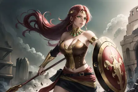 postive promt for most of the colosseum pictures: ((best quality)), ((masterpiece)), ((realistic)), (detailed), (1 girl) women, pyrrha nikos a woman with long red hair wearing a brown corset and armor holding a spear and a shield, green eyes, full body, looking at viewer, solo, detailed background, (tribal background:1.2), colosseum, closed mouth, absurdres