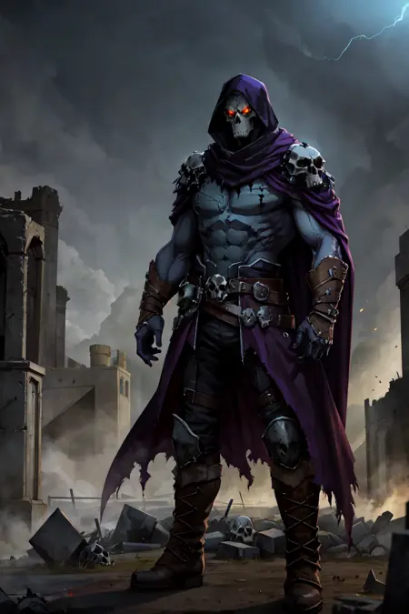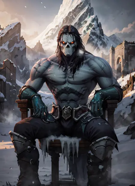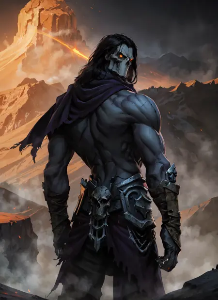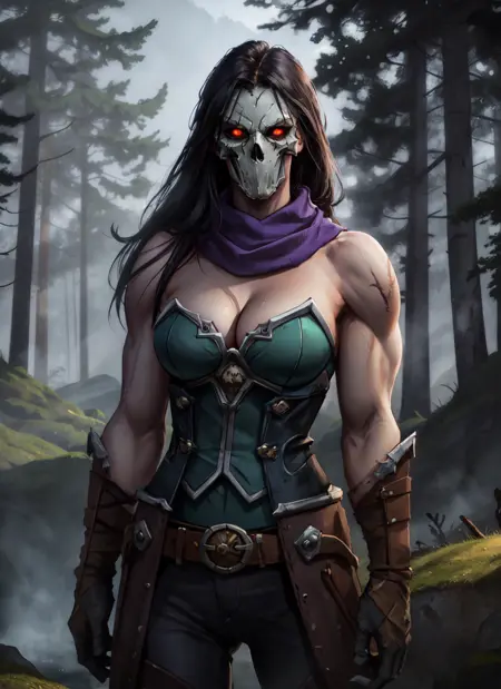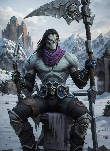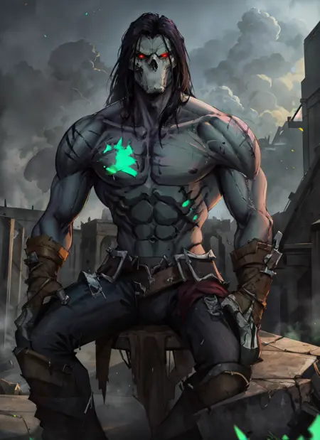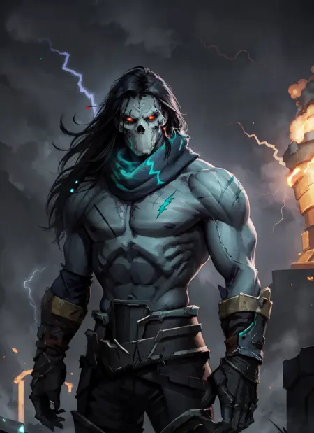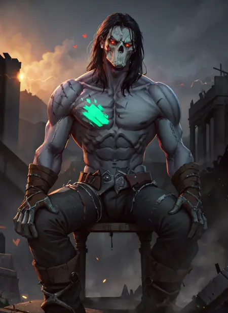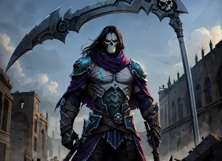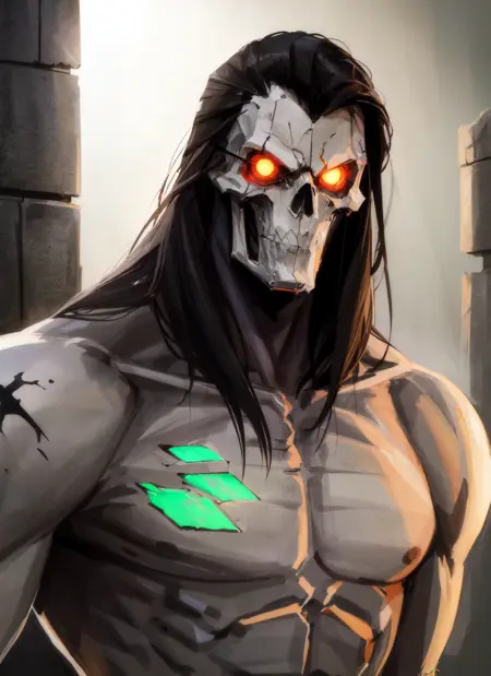 또한 아래 항목을 추가하면 더 좋을 수 있습니다: 빛나는 눈, 근육질, 윗몸 노출, 스카프, 망토, 갈색 뼈, 쥐고 있는 낫