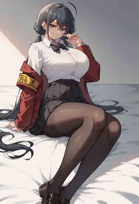 • 放学后的甜蜜时光(校服)MLTaiSchool, 白衬衫,黑裙子,红夹克,黄臂章,低扎双马尾,校服,黑色丝袜,乐福鞋,眼镜,黑色蝴蝶结,百褶裙,微笑