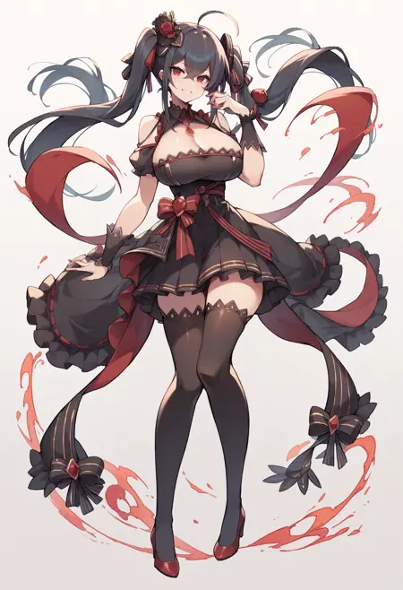 • 缪斯(偶像)mltaidol, 黑色偶像裙,荷叶边,黑色过膝袜,高跟鞋,发饰,发带,红色滚边,(短裙),巨乳,简洁背景,露肩,双马尾,(短裙),微笑, - 括号用于对齐提示
