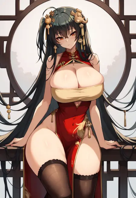 • 凤凰春歌(春节/旗袍)mltaiqipao, 露肩,黑色过膝袜,中式旗袍,中国风服饰,深V胸口,金色胸衣,金色发饰,腰臀帘,红色旗袍,无袖连衣裙 — 这款可能需要在负面提示中加入“双马尾”