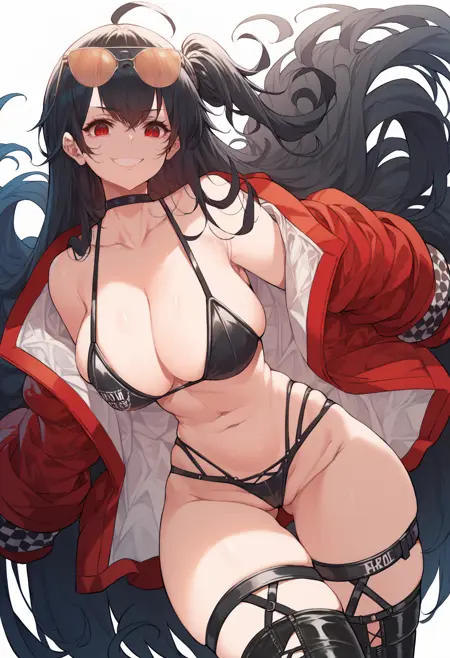 • 迷醉同伴(Race Queen)MLTaiRQ, 黑色比基尼,黑色项圈,丰满胸线,高衩比基尼,多带式比基尼下装,单侧高开衩,Race Queen,大腿绑带,黑色过膝靴,墨镜,红色夹克 — 将红色夹克替换为“露肩”可完全移除夹克