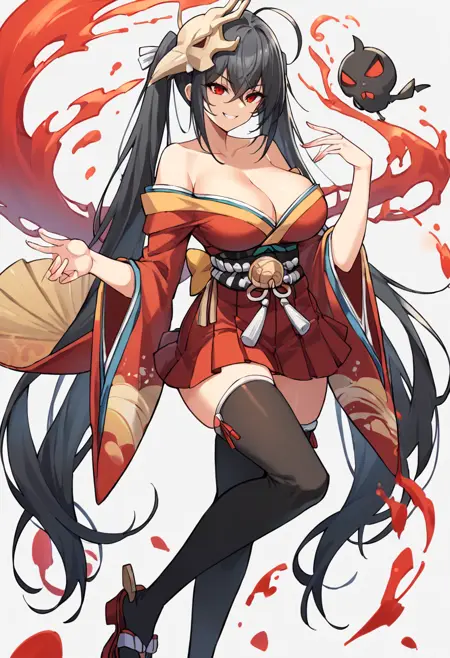 基础款:MLTaiho, 露肩和服,短和服,双马尾,绝对领域,宽袖,黑色过膝袜,袴短裙,红色和服,简洁背景,红眼,交叉刘海,微笑,舵靴