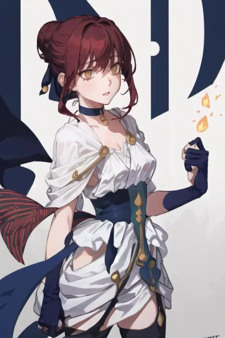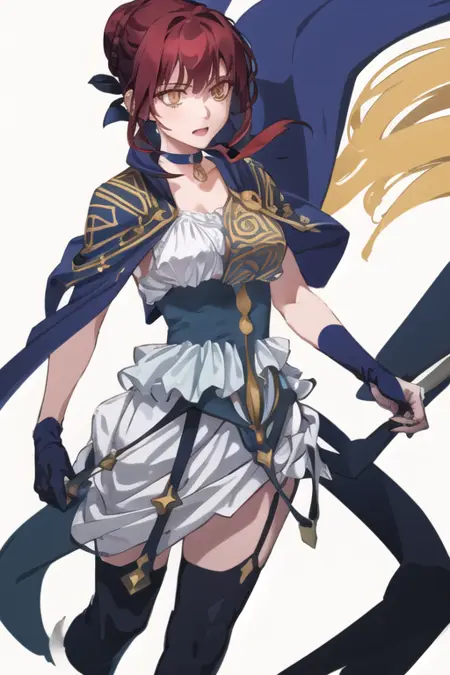 HippolytaFate, 1girl, solo, dark red hair, black thighhighs, gloves, white dress, hair ribbon, yellow eyes, braid, choker, hair bun, blue cape,