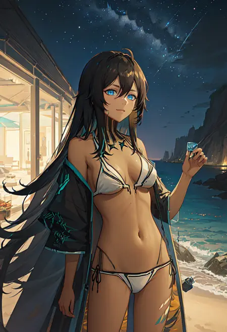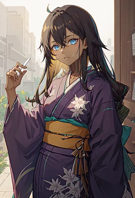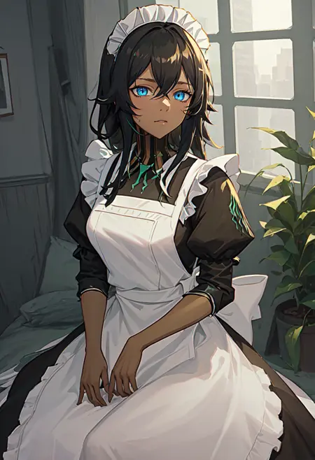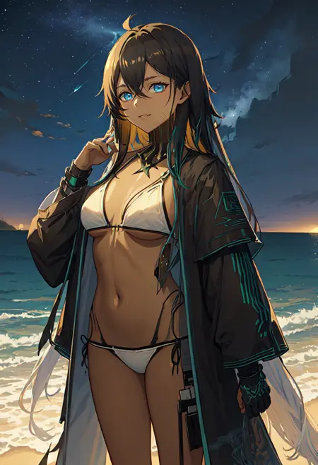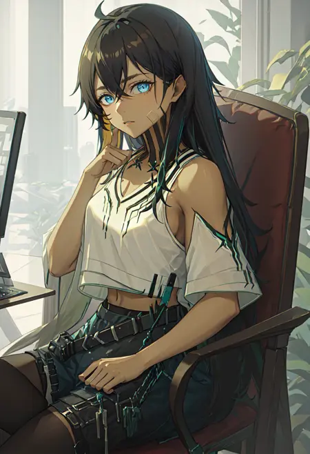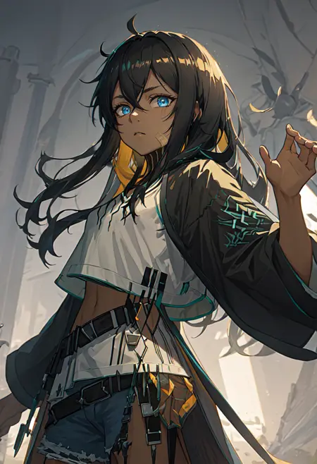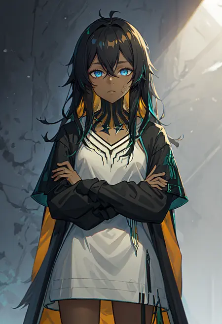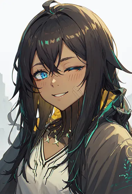 - 축소된 캐릭터 태그는 긴 머리, 파란 눈, 검은 피부, 검은 피부를 가진 여성, 눈 사이의 머리카락, 검은 머리, 얼굴의 붕대, 갈색 머리, 가슴입니다. 캐릭터의 핵심 특징(예: 머리색)이 안정적이지 않을 경우 이러한 태그를 프롬프트에 추가할 수 있습니다.