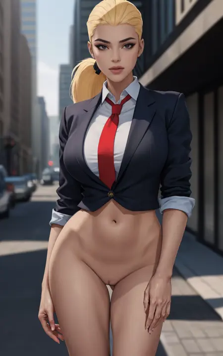 1girl, blonde hair, very long hair, dark skin, dark-skinned female,  long hair, ponytail, black eyes, lips, breasts, makeup,