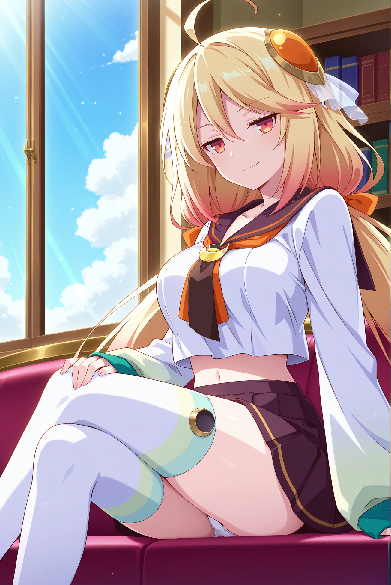 외모: 노란 눈, 그라데이션 헤어, 긴 머리, 큰 가슴, ahoge, 머리 장식