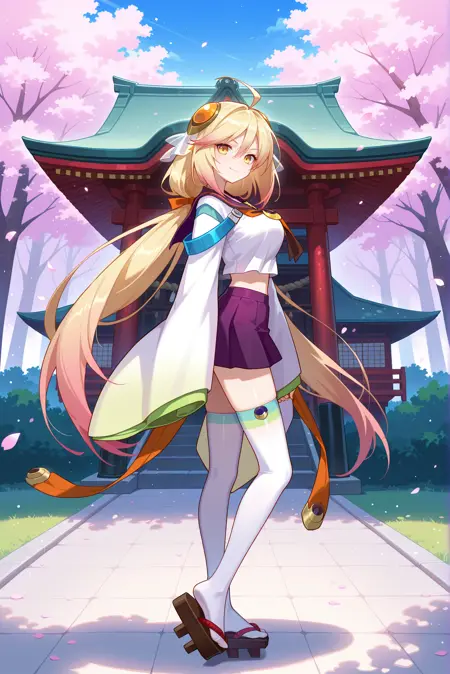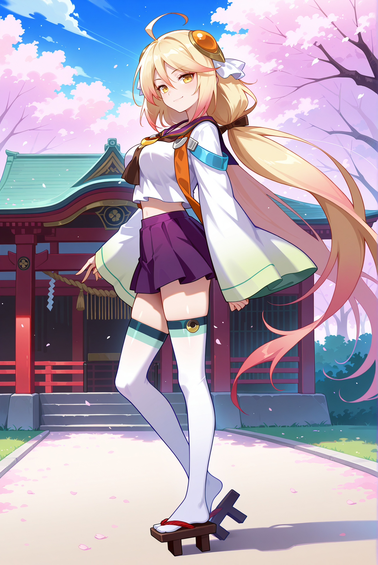 복장: serafuku, 허리 노출, 보라색 치마, 미니스커트, 흰색 허벅지 스타킹, 손목을 넘는 소매, 일본식 옷, geta