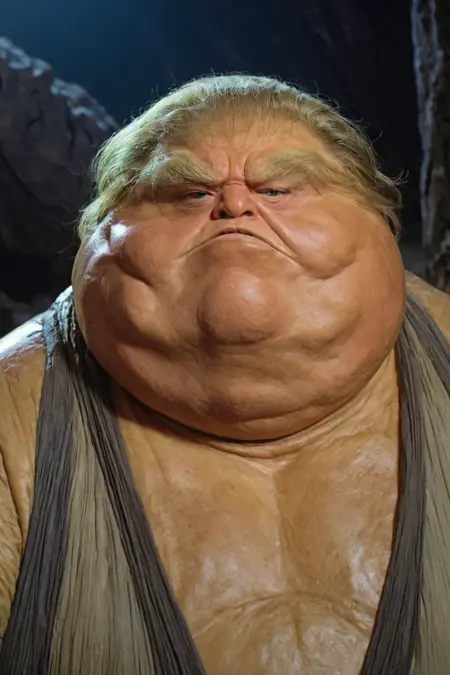 Use "with giant fat head and a tiny face" in your prompt if you want to help it along.
