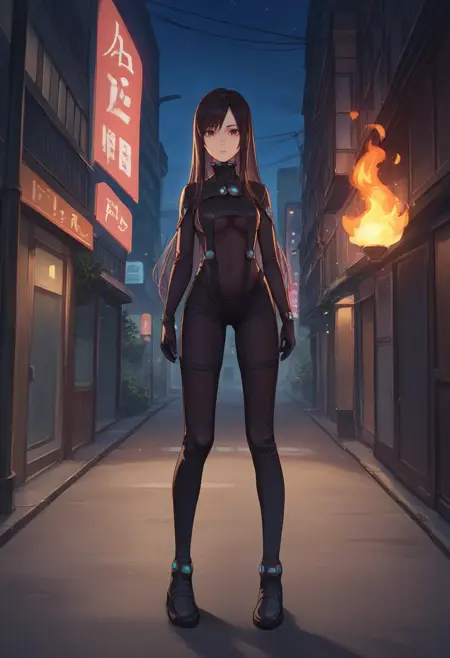 默认服装: 暴露的衣物,黑色紧身衣,下胸露,黑色手套