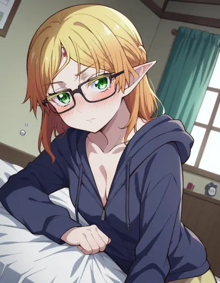 傲娇精灵,中长发,金发,绿眼,眼镜,尖耳朵,精灵,黑框眼镜,