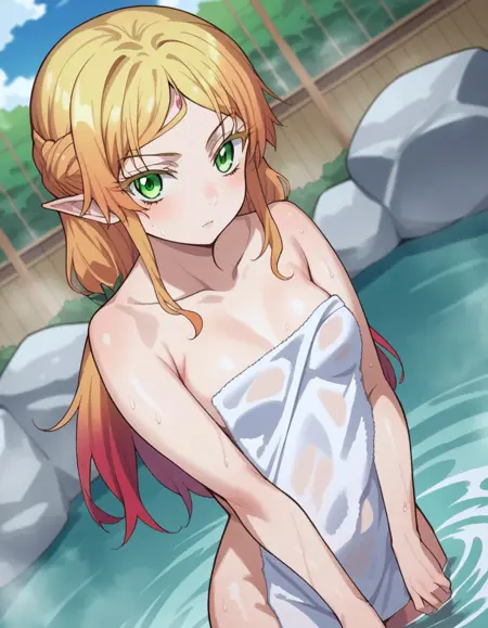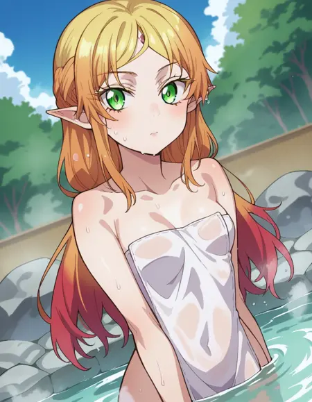 傲娇精灵,长发,金发,绿眼,尖耳朵,精灵,多色发,额饰,