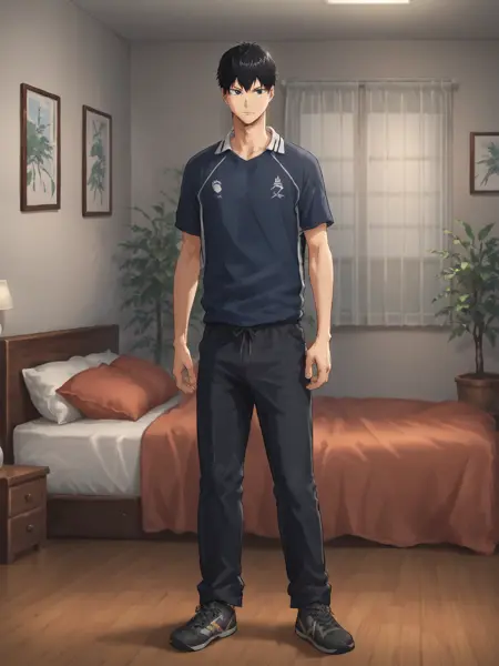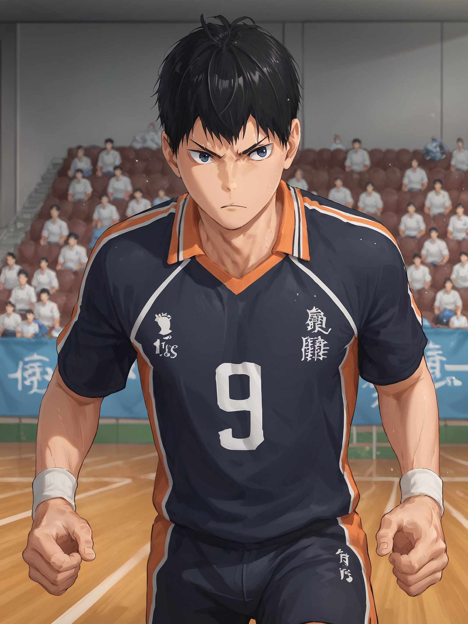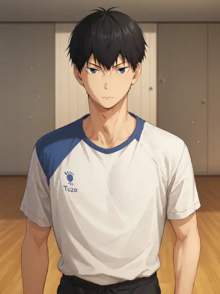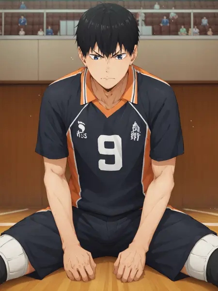 "tobio kageyama, 1boy, male focus, solo, black hair, black eyes, blue eyes, volleyball uniform, sportswear"。