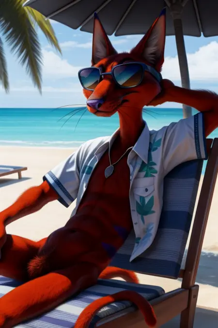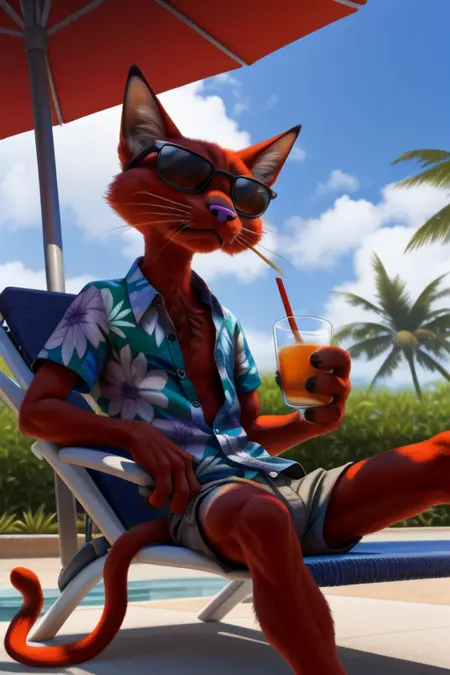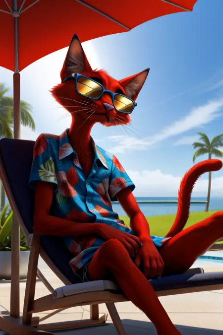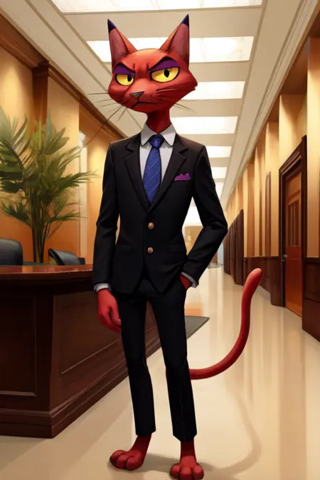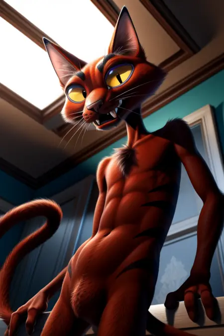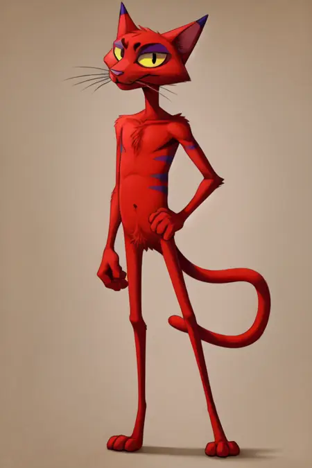 ヘルパーチャグ: 赤い毛、黄色い白目、ひげ、猫の尾、縞模様の体、アイライナー、紫色の鼻