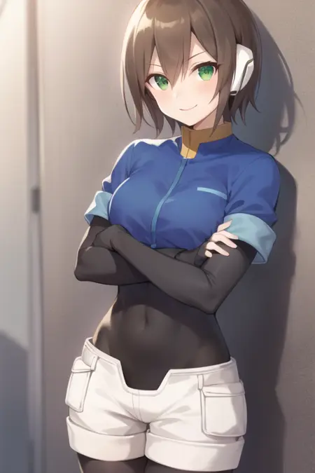 짧은 머리, 갈색 머리, 짧은 소매, 바디수트, 로봇 귀, 초록색 눈, 소매가 긴 옷 over 짧은 소매