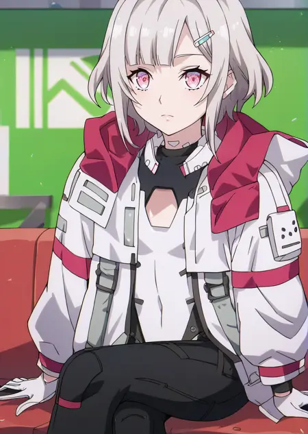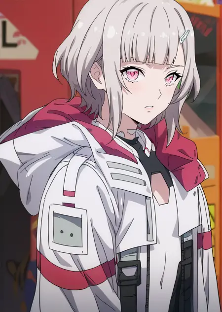 ada,short hair,hair ornament,hairclip,grey hair,blunt bangs,flipped hair,pink eyes, || white jacket,open jacket,hooded jacket,hood down,clothing cutout,white bodysuit,black pants, white gloves,black crotch plate