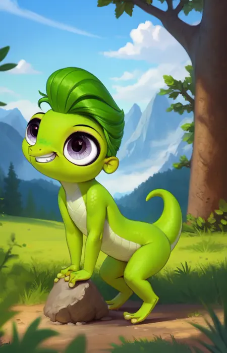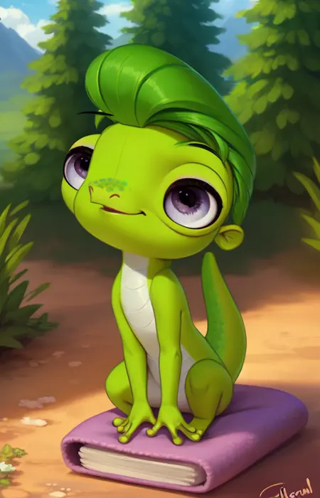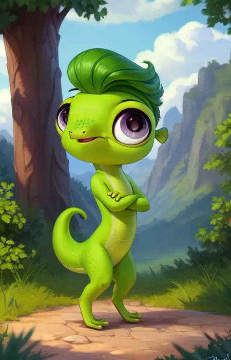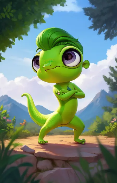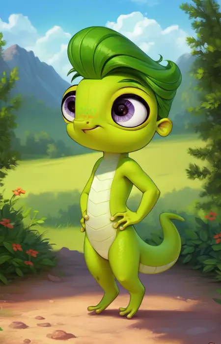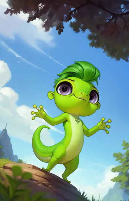 VinnieTerrioCartoon, Gecko, green gecko, purple-gray eyes,