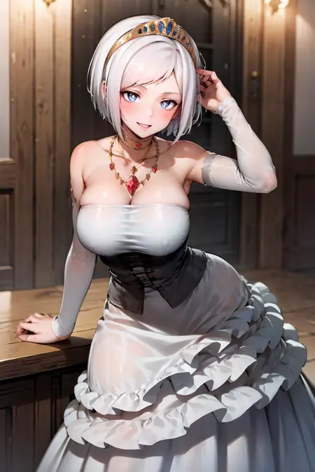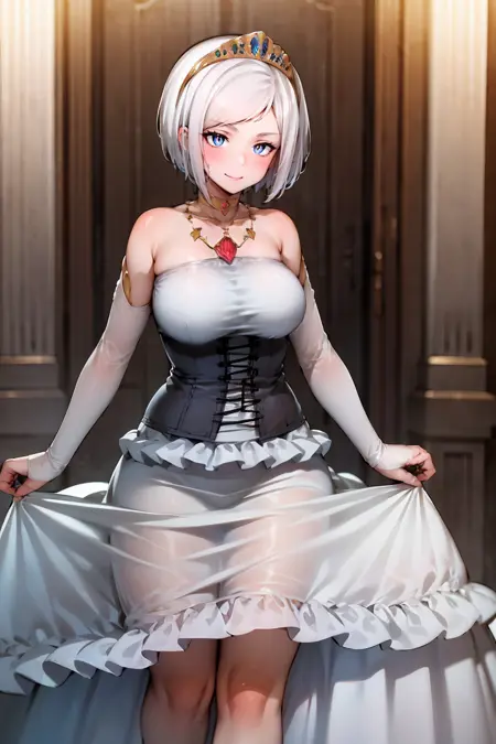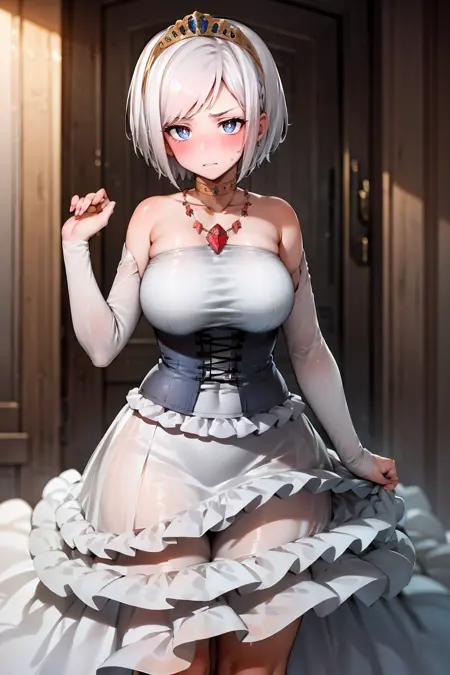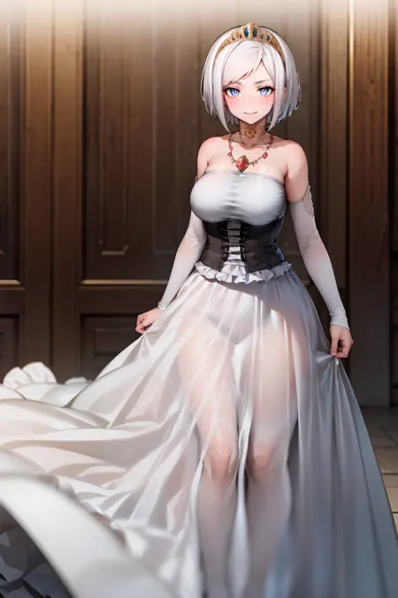 outfit: princess, bare shoulders, jewelry, white dress, necklace, corset, tiara, detached sleeves, collarbone, choker, gown, evening gown, frilled skirt, long skirt, white skirt