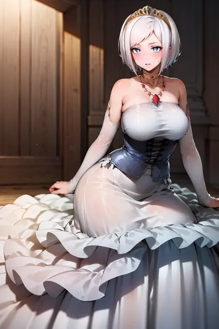服装:公主装,露肩,珠宝,白色连衣裙,项链,紧身胸衣,王冠,分离袖子,锁骨,项圈,长裙,晚礼服,荷叶边裙摆,长裙,白色裙子