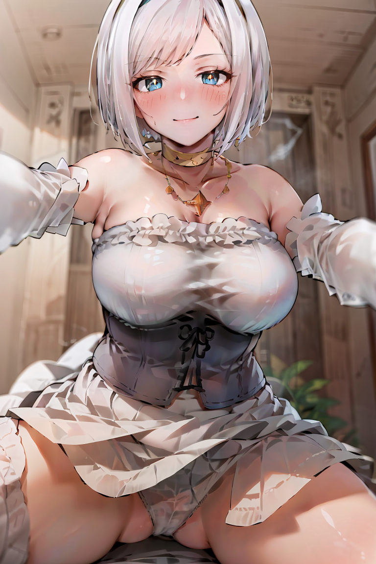 chara: white hair, short hair, blue eyes, large breasts, (white pupils, bright pupils:1.2)
