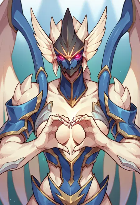 score_9, score_8_up, score_8, source_furry, 1girl, lora:SoulSaverDragon:0.9 no humans, claws, helmet, breasts, wings, shoulder armor, glowing eyes, colored sclera, heart hands,