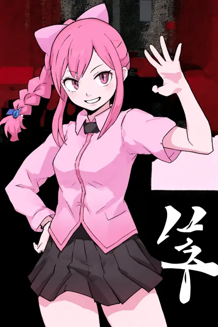 SSRHM, 핑크 자켓, 블랙 스커트, 블랙 셔츠, 핑크 헤어, 핑크 눈, 측면 번개, 헤어 리본