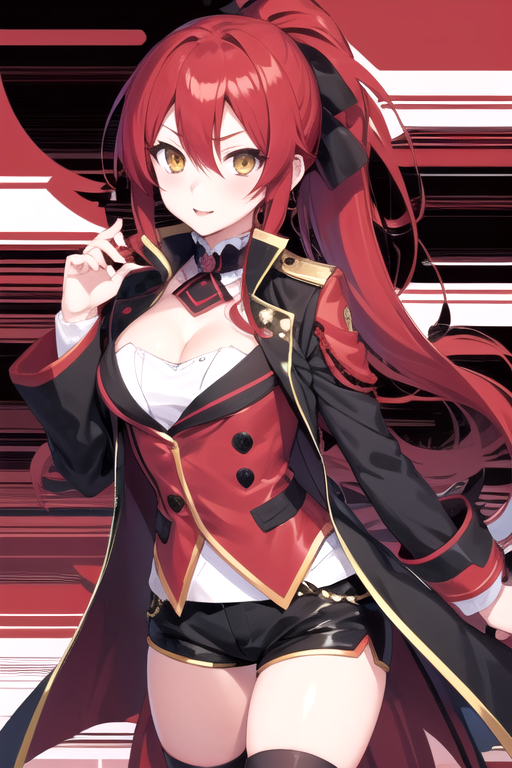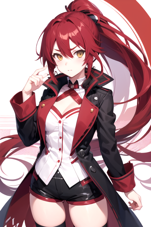HimekoZero, 1girl, solo, long hair, white shirt, black thighhighs, long sleeves, cleavage, hair between eyes, black coat, yellow eyes, ponytail, red hair, short shorts, black shorts, murata himeko