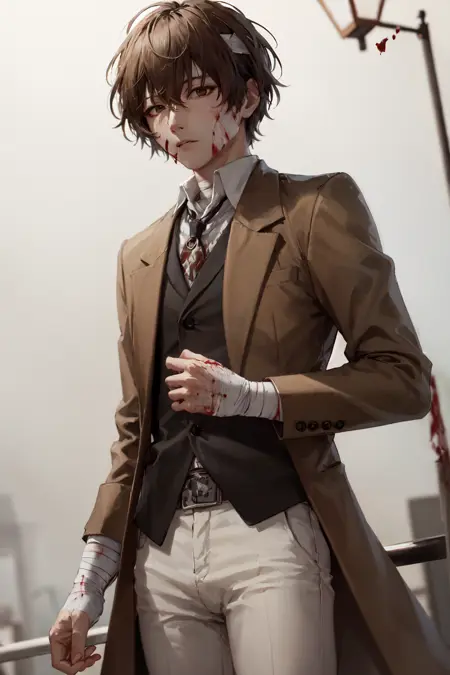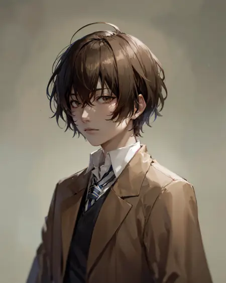 주요 외모는 다자이 오사무로 설정하세요. 약간 어색해 보이면, 짧은 갈색 머리와 갈색 눈동자를 추가하세요.