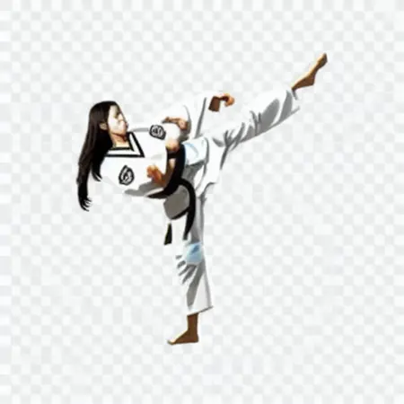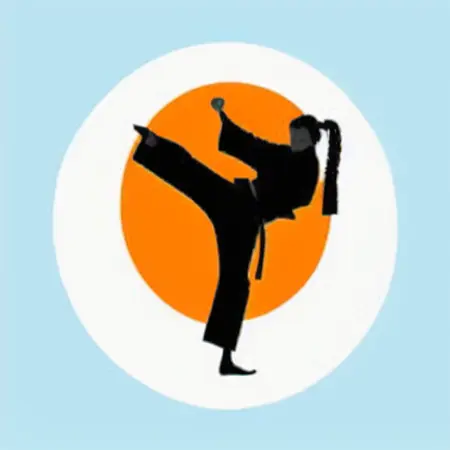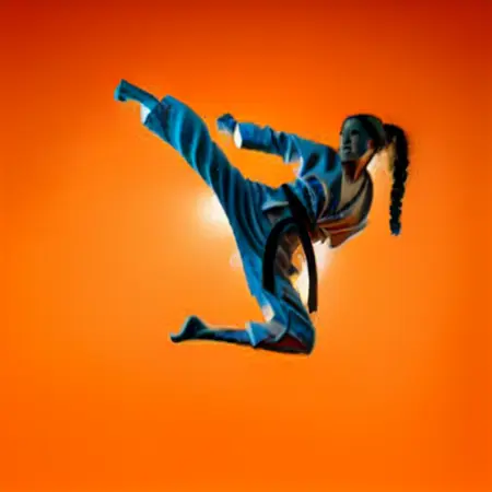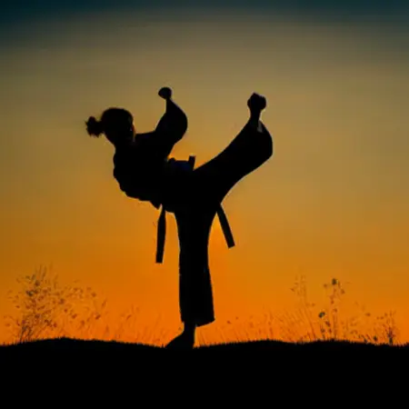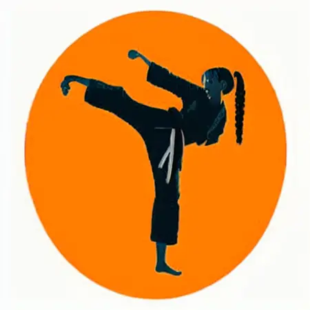 karatekick, 1girl, silhouette, day, karate kick, realistic, white background, orange background, pants, tree, blue sky, solo, standing on one leg, greyscale, black belt