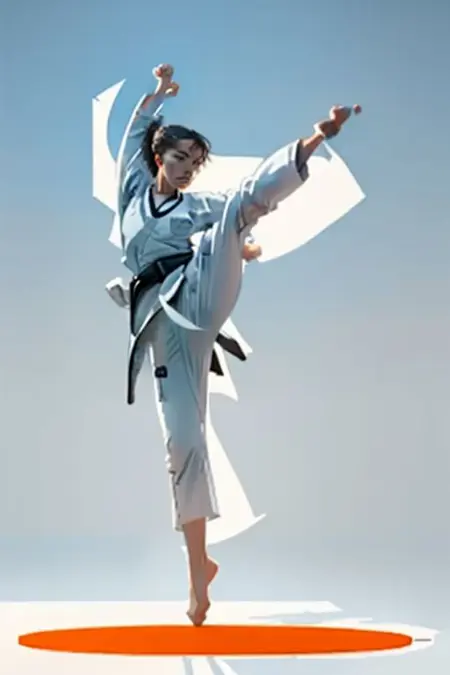 空手踢腿,1个女孩,剪影,白天,空手踢腿,写实,白色背景,橙色背景,裤子,树,蓝天,独身,单腿站立,灰度,黑带