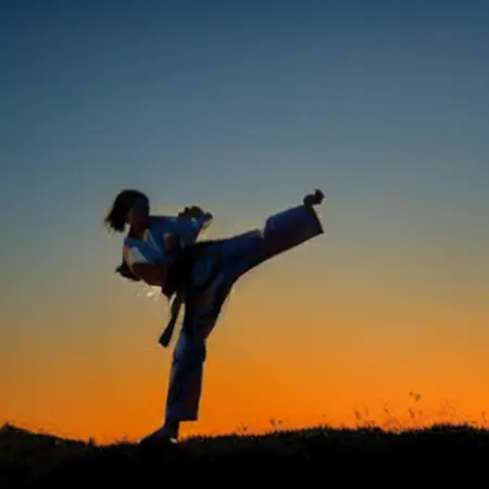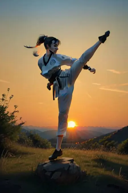 karatekick, 1girl, silhouette, sunset, karate uniform, day, shirt, black belt, from side, gloves, scenery, martial arts belt, motion blur, high kick on top of mountain, grass