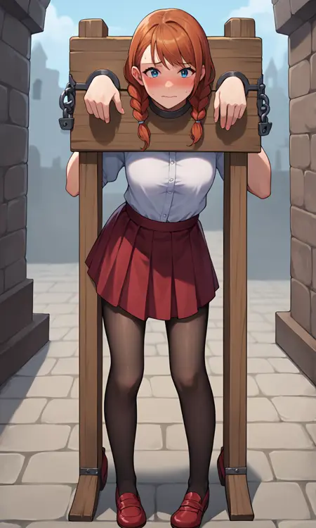 The trigger words are "pillory", "stocks" and "bondage" I suggest using them at 1.2 to 1.3