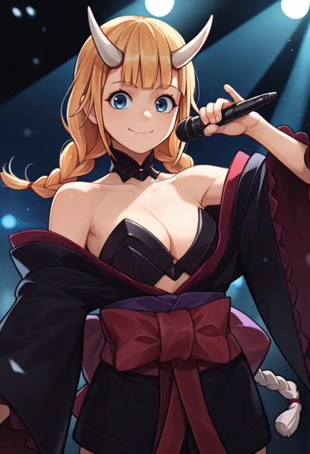 ハロウィンコスチューム: 角、黒い着物、短い着物、片肩出し、帯、帯、長袖、広袖、ブライダルガウン、肩出し、胸元