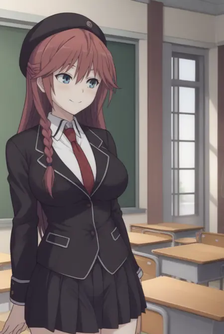 학교 복장: ["lillith asami, blue eyes, red hair, long hair, side braid, single braid, school uniform, hat, beret,white shirt, collared shirt, red necktie, plaid necktie, black jacket, long sleeves, pleated skirt, black skirt"]
